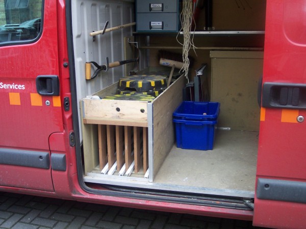 Details: As many of the pictures on this site show, bus station support vehicles are typically medium-sized vans such as Ford Transits or, as seen here, Vauxhall Movanos. These carry a variety of equipment to enable them to deal with incidents and bus route diversions. Inside the front of 5206V (Y358SLD), photographed at Bow in February 2004, can be seen a rack containing temporary bus stop poles, flags and bases, shovels and brooms, and a cabinet for notices and timetables. |