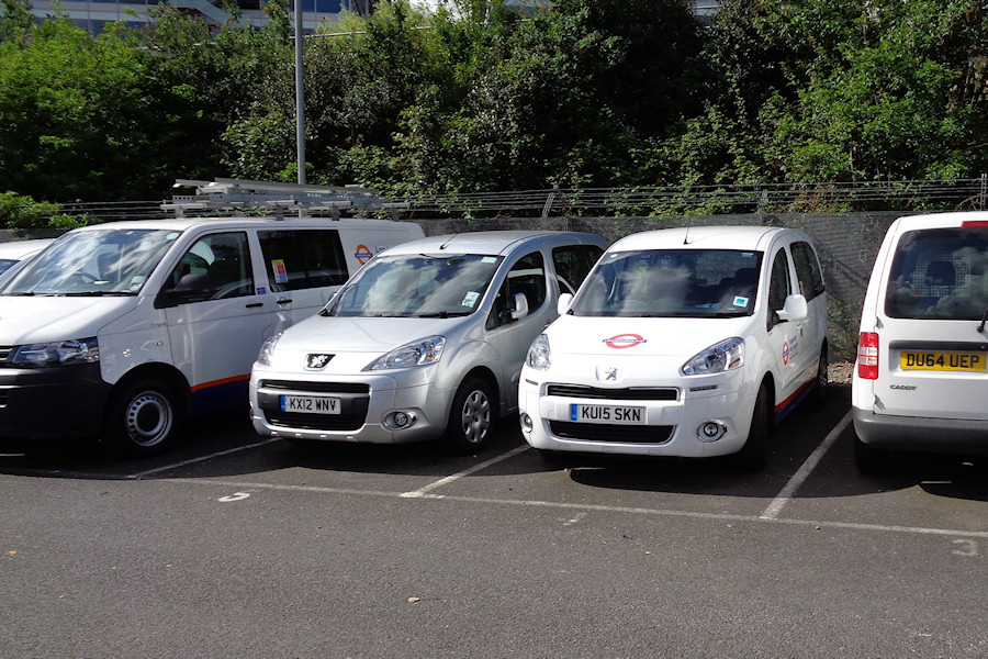 Details: Not all the service vehicles in the Acton Works car park on 30th April 2015 were brand new. Seen here are London Overground Volkswagen Transporter crew van 7776VW (which was also present earlier in the month), unmarked silver Peugeot Partner Tepee KX12WNV (which is included in the LTSV database since it carried labels for a time) and similar but LUL-liveried 8021P. Based on its registration series, the Volkswagen Caddy van on the right is unlikely to be a service vehicle. |