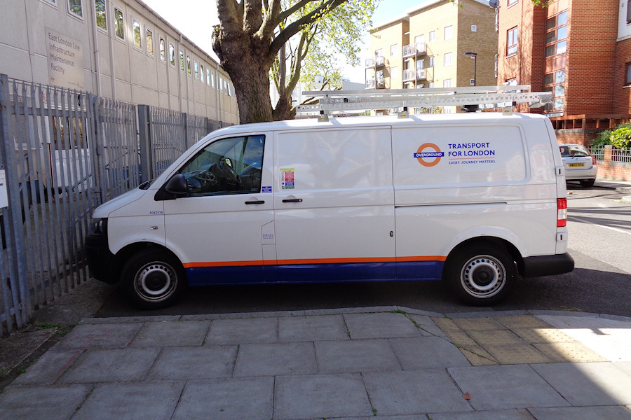 Details: Ray has reported a number of vehicle sightings at 'Oldfield Grove ELLIMF', and I should perhaps add this as a location. As the sign on the Portakabins to the left shows, this is the East London Line Infrastructure Maintenance Facility, and it is located just to the north of Silwood Depot. A new vehicle seen there on 28th April 2015 was Volkswagen Transporter van 8043VW. The fact that the door runners do not reach the rear of the vehicle shows that this is a long-wheelbase variant. |