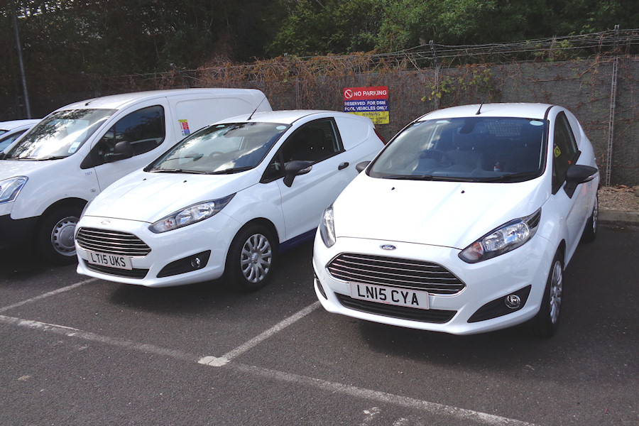 Details: Five Ford Fiesta vans were present in the car park at Acton Works on 30th April 2015, all still in anonymous as-delivered white/blue livery. Seen here are LT15UKS and LN15CYA, with Citroen Berlingo van 7577 (unmarked apart from fleetnumbers and noise-abatement notices) beyond. Note that Fiesta vans have black wing mirrors, while the cars have white ones. |