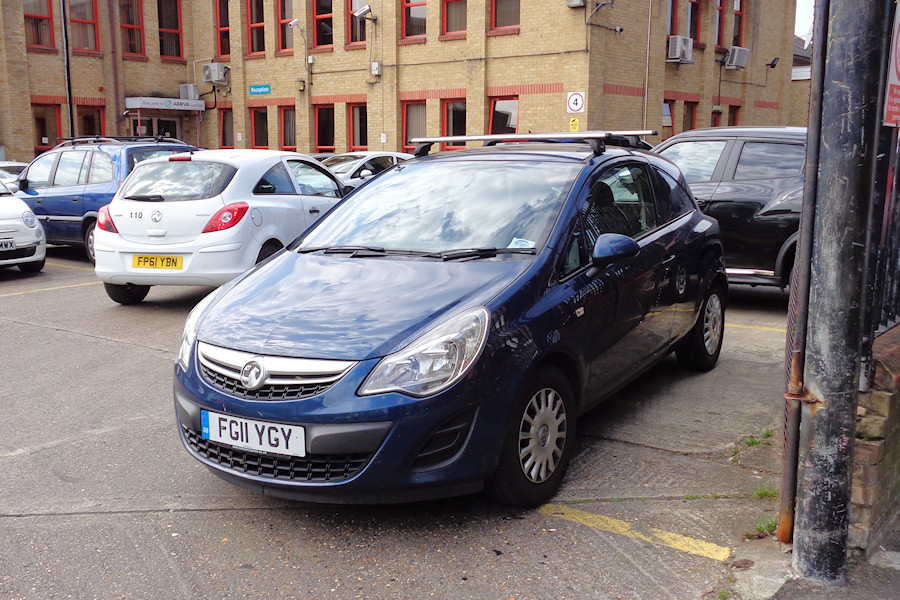 Details: Arriva London appears to operate quite a few anonymous service vehicles, mainly in silver or dark blue colour schemes. These seem to be for administrative functions rather than crew ferries or engineering support, and several can usually be found parked at the offices behind Wood Green garage (off Watsons Road). On 16th April 2015, Vauxhall Corsa van FG11YGY was found there, having been seen at Enfield Garage in 2013. Also visible is Vauxhall Corsa crew ferry car 110 (FP61YBN), normally working from Edmonton. |