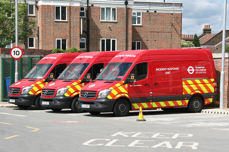 Details: New IRUs, take 3. Three of the 16 Mercedes-Benz Sprinter vans delivered in May 2015 went to Turnpike Lane Bus Station. Neatly lined-up on 3rd June 2015 were 7843M, 7852M and 7850M. |
