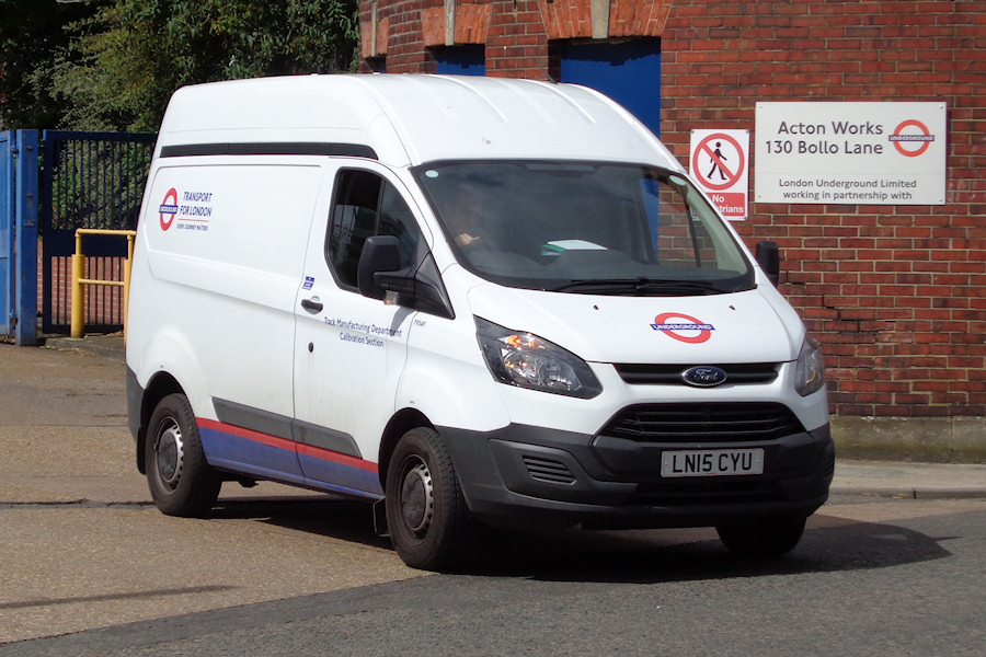 Details: Caught as it was leaving Acton Works on 7th May 2015, 7954F is a high-roof Ford Transit Custom van with rather unusual lettering. On the cab doors is 'Track Manufacturing Department, Calibration Section'. Although it was reported at Frank Pick House later that month, I would imagine it is allocated to Ruislip Depot. Writing this caption I have made a belated realisation. Vans in the original LUL white/blue livery (and also the Tube Lines and Metronet variations) usually had the company name and logos in two positions on each side. A larger version was placed near the rear on the bodyside, with a smaller copy on the doors. The red-stripe LUL livery has just one on each side, plus one on the front. There is therefore space on the doors for department lettering, but very few examples have been noted. |