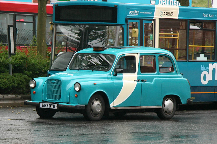 Details: Looking fairly smart in Arriva turquoise and cream livery, N83OYW is a Carbodies FX4 taxi allocated fleetnumber CF96 with Arriva the Shires at High Wycombe. It was photographed on 13th June 2015. |