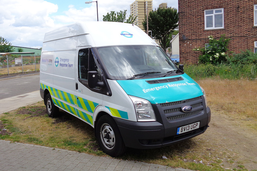 Details: The livery carried by Docklands Light Railway (DLR) emergency vehicles is distinctive to say the least. Seen at Abbey Road station on 8th June 2015, Ford Transit van BV13UGP carries fleetnumber 001 above the windscreen. The contract for infrastructure maintainence on the DLR passed from Serco to Keolis Amey in December 2014, and the new name has been applied to this van. |