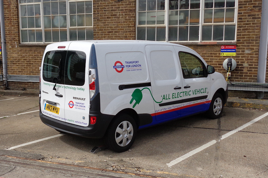 Details: Seen at the electric vehicle charging points in Acton Works on 25th June 2015 was Renault Kangoo ZE van HN13MYU. Licensed in July 2013, it was first noted in fleet livery at the Renault dealers in North Acton in November 2014. It was then seen at Edgware Road Station (which has had a string of electric vehicles allocated recently, presumably on trial). It has been elusive though, with this being only the third time it has been reported. Note that the van carries the green plug graphic and lettering in addition to the TfL electric fleet slogan. It is also curious that this van is badged as a plain Kangoo but appears to be the same longer size as the Kangoo Maxi. |