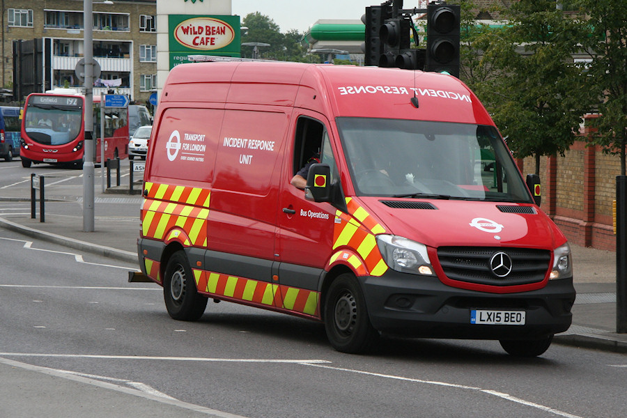 Details: Incident Response Unit 7850M was seen passing Tottenham Hale Station on 2nd July 2015. I'm in no hurry to show all 46 of this batch of vans on LTSV, although we were lucky to have caught 7862M in February. That van appears to have suffered accident damage a few days later and has not (yet) returned to service. The bus in the background is of interest, being one of 16 Wright Streetlight WFs (wheel forward) delivered to Go-Ahead London in January/February 2015 for route 192. Numbered WS33 to WS48 they lasted only six months, being replaced by newer WS49 to WS64 in August. The first batch were apparently on loan from Wrights pending the development of a flywheel-compatible version. |