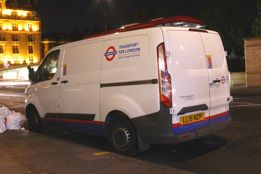 Details: Most of the fleet of vehicles used by the former Tube Lines Lifts and Escalators section were replaced with new Fords in 2015. Large batches of Transit Custom crew vans and Transit Courier vans arrived in the spring, followed by half a dozen Transit Custom vans in July. 8054F was one of the latter and was found parked opposite Green Park Station on the night of 19th August. As with most of the vehicles 'based' at Frank Pick House, this van only rarely visits its home. |