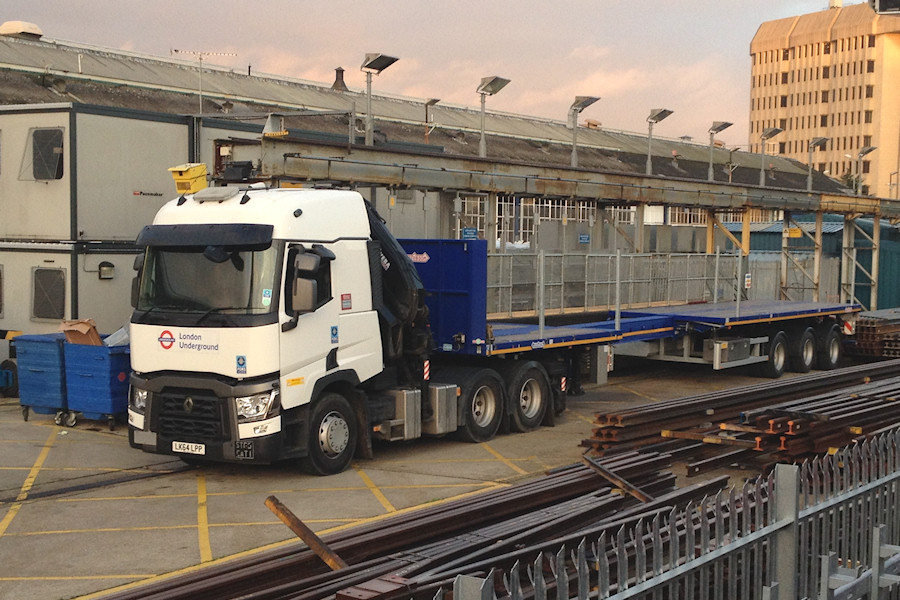 Details: Ah, something big at last! This photo was taken at Lillie Bridge Depot on 29th October 2015 and shows a Renault T460.26 3-axle crane-fitted tractor unit in plain white livery with LUL labels. It was coupled to a Nooteboom extending trailer in a very LUL-like blue livery. However, I would be very surprised if either vehicle is properly taken into stock. The yellow object above the lorry cab is attached to the structure behind, while the photo was taken from the recently added train sidings. |