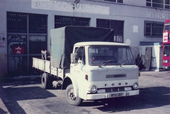 Details: A batch of four Ford D0607 half-tilt lorries was delivered in Autumn 1978 and allocated to bus garages in the engineering support role. 2131F (WYU131T) spent its entire life at Catford garage, where it was photographed on 12th March 1985. Tilt covers, where fitted, always seemed to be of green canvas. |