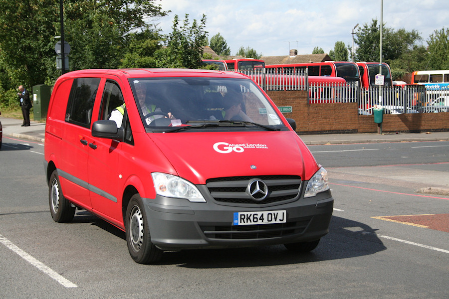 Details: Passing Bromley Garage on 13th August 2016, RK64OVJ is a Mercedes-Benz Vito crew van new to Go-Ahead London's Blue Triangle operation in autumn 2014. It was seen at the new River Road garage in July 2016 but was evidently working from Orpington the following month. The odd buses in the garage yard in the background were on display as part of the open day being held. |