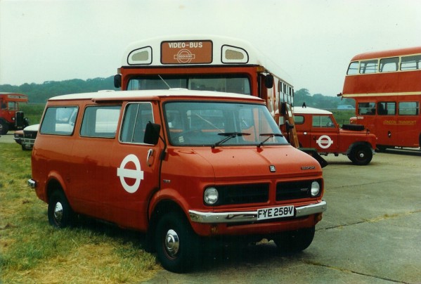 Details: Bedford CF230 minibus 2258B (FYE258V) was withdrawn in September 1983 after three year's use. It was then restored by engineering apprentices at Clapham garage and repainted from dark grey to red with white roof and roundels. Used as a display vehicle, it made appearances at a number of rallies, including North Weald on 22nd June 1986 as seen here. In the background are AEC Swift mobile classroom STB91, Land Rover 1761LR and an AEC Regent breakdown tender. |