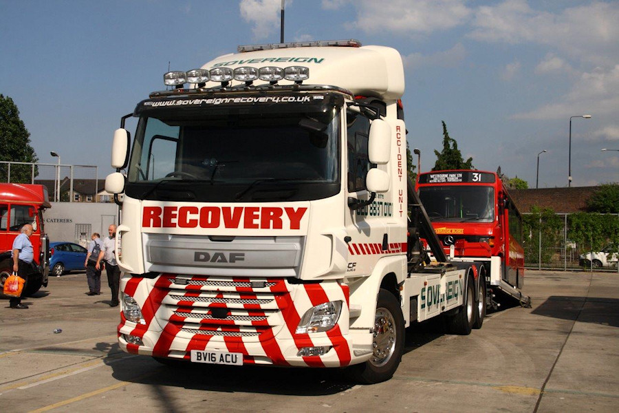 Details: A 'bus show' was held at Stagecoach London's West Ham garage on 23rd July 2016, with numerous vintage and current buses on display. Sovereign Recovery had three vehicles on show, including DAF XF RO14TOR and Skoda estate car DK65WUT. The third vehicle was BV16ACU, a three-axle DAF CF lorry fitted with a tilting flat-bed. I wasn't going to add this to the database since this type is not normally used for bus recovery work. However, it is clearly capable of carrying at least smaller buses, with preserved Centrewest Mercedes-Benz minibus MA1 seen about to be hoisted on-board. A large fleet of these minibuses worked on Gold Arrow (routes 28, 31 and 70) and U-Line (Uxbridge area) services from the late 1980s. Curiously MA1 had blinds for the former but logos for the latter.