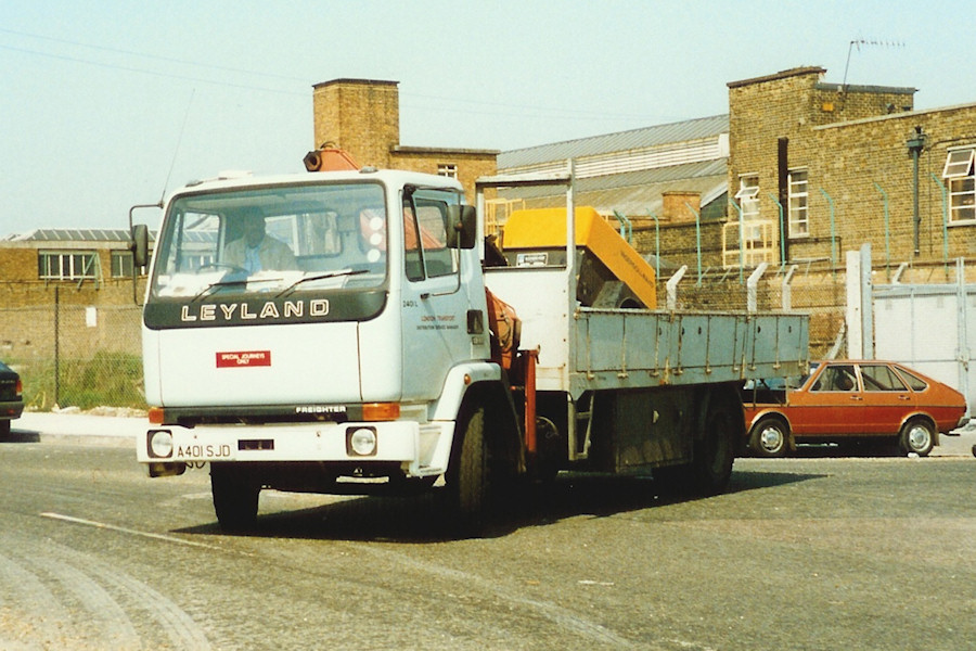Details: Leyland introduced the first of its T45 range of trucks in 1980, these featuring an attractive cab created by Ogle Design. Different configurations of vehicles had different model names, London Transport buying two examples of the Cruiser articulated tractor and eleven of the rigid Freighter. Six of the latter were bodied as bus recovery vehicles while five became dropside lorries. 2401L was a Freighter 13.11 new on 6th December 1983, the same day as larger Freighter 16.13 2395L. It was based at Chiswick Works, moving to Acton Works when Chiswick closed and finally being sold in 1992. This undated photograph shows it leaving Wandsworth Bus Garage with a portable compressor on board. All but one of the Freighter lorries were fitted with folding cranes behind the cab. Note the label on the front, which reads 'Special journeys only'! |