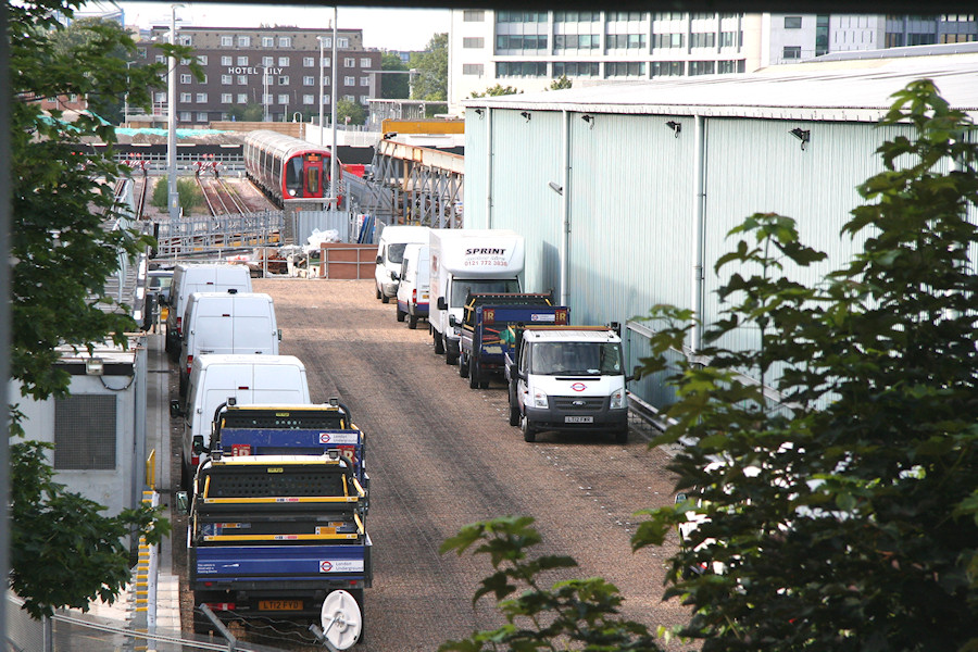 Details: Looking into Lillie Bridge depot from the Cromwell Road bridge on 29th June 2016, this view is very similar to one taken in February 2015, with one significant difference. The Earls Court exhibition centre, which used to dominate the backdrop, has been demolished. As such you can now see all the way to the Hotel Lily on Lillie Road. The main vehicle access to Lillie Bridge depot used to pass under the exhibition centre to come out opposite the hotel. Now, all vehicles have to use the narrow Beaumont Avenue alongside West Kensington Station. In terms of the service vehicles visible, only Transit dropsides 7237F (left) and 7243F (right) can be positively identified. At the back of the right-hand row is a high-roof Ford Transit Custom van, most likely 7954F. Note also that the new sidings in the distance are now being used to stable S-stock trains. |