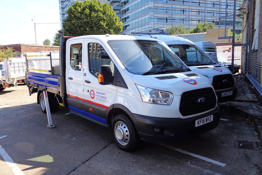Details: The only 16-reg Ford Transit seen at Acton Works on 30th August 2016 was dropside truck 8071F, new the previous month. Fitted with a crew-cab and tail-lift, it also has a large tool locker in the loadspace, resulting in the safety railings being shorter than normal. Crew van 8034F was parked alongside, while visible on the left is the tail-lift of DH65ACV, a Mercedes-Benz Sprinter dropside truck believed to be on hire. You could get some brilliant photos from the office block in the background... |