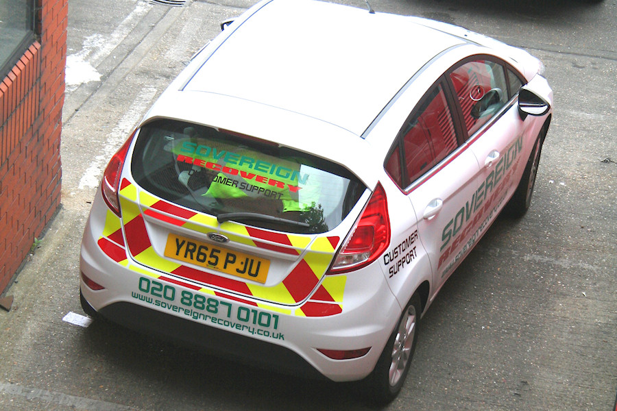 Details: Sovereign Recovery used to be noted for operating some of the largest service vehicles in London, with their 3- and even 4-axle tow trucks. They also have a fleet of medium-sized vans but now also have a couple of cars in their distinctive livery. YR65PJU is a Ford Fiesta car new in autumn 2015 and found on 10th August 2016 parked at Edgware garage. As the angle suggests, this photo was taken from the adjoining supermarket car park, looking down into the London Sovereign (no connection) yard. |