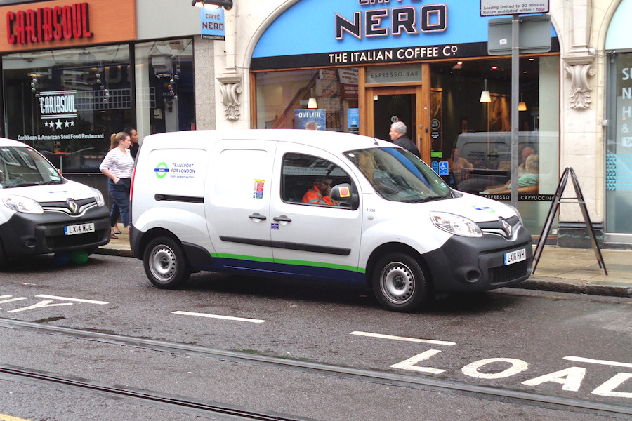 Details: The Tramlink operation was allocated four new Renault Kangoo Maxi vans in 2014, joined by a fifth in spring 2016. The latter was 8173R, photographed in George Street (Croydon) on 29th September 2016. Earlier 7810R was parked behind. |