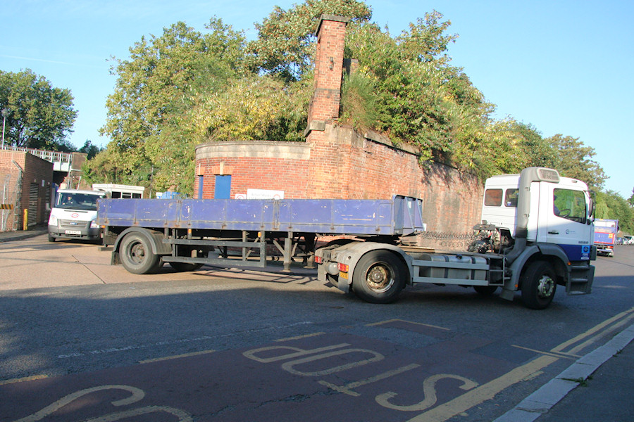 Details: This photo taken outside Acton Works on 30th August 2016 shows two of the oldest vehicles in the central fleet. 2581M is one of two Mercedes-Benz Atego artic tractor units new in September 2002 and now the oldest licensed vehicles in use. It was coupled to trailer CT34 which, having been taken into stock on 21st February 1984, is by far the oldest vehicle in the overall fleet. Three other trailers new on the same day may still be in stock but have not been seen in use for some time. Also visible in this photo are MAN lorry RV12OEY heading up Bollo Lane and Ford Transit van 7651F. |