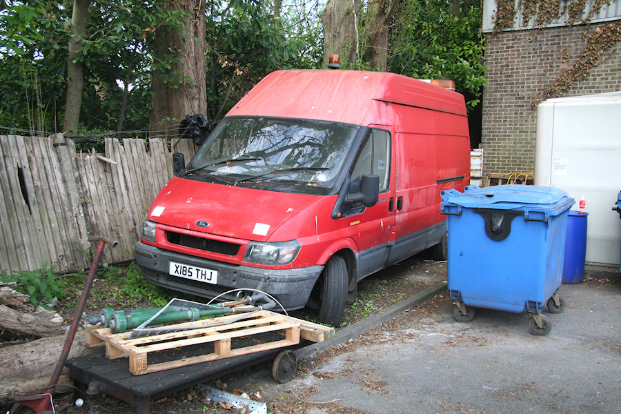 Details: Ford Transit Mk6 van X185THJ served as the engineers van at London Sovereign's Harrow garage for about ten years. Replaced by new Ford Transit Custom van LS15OXJ in 2015, it was dumped at Twickenham Garage, where it was photographed on 8th May 2016. |