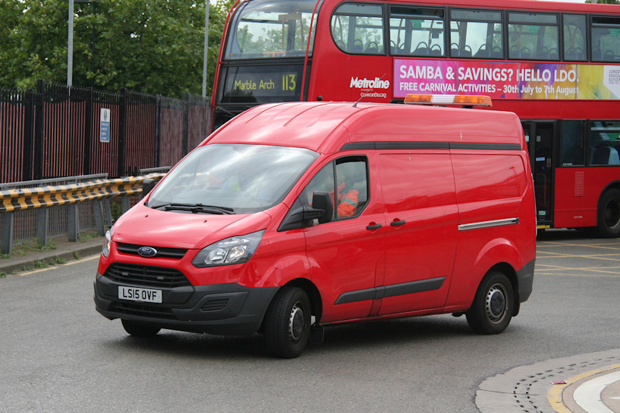 Details: Two new Ford Transit Custom vans were delivered to London United in spring 2015 and, after a couple of months storage at Twickenham, they were allocated to the former London Sovereign garages at Edgware and Harrow. LS15OVF was sent to the former and was photographed in the adjoining bus station on 10th August 2016. Allocated fleetnumber FT10, this van unfortunately remains in unmarked red livery. |