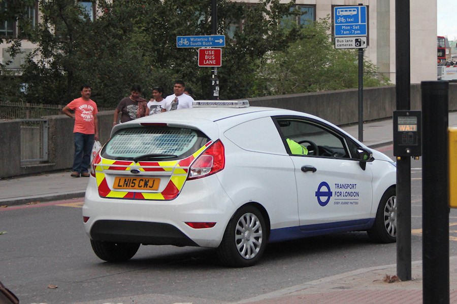 Details: There are at least 8 Ford Fiestas in TfL white/blue livery (six vans and two cars) and they are proving to be difficult to track down. Malcolm recently sent in a nice photo of 7986F parked at Edmonton, but since that one has already been featured on LTSV twice I opted to instead use this photo caught by Colin Lloyd at the Imax roundabout at Waterloo on 8th September 2016. It shows van 7984F passing, perhaps on its way back to Chancel Street. |