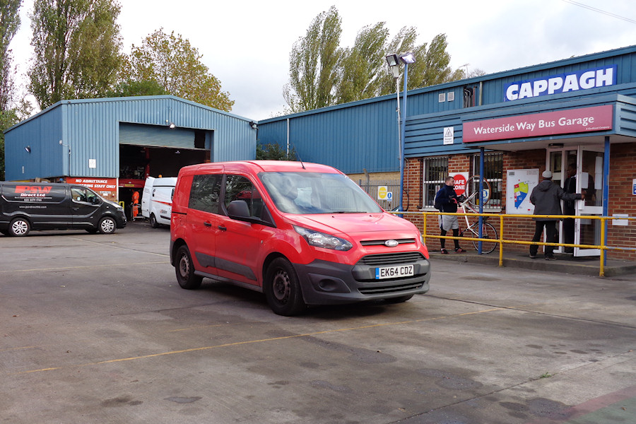 Details: Plough Lane Garage now has three unmarked Ford Transit Connect Mk2 crew vans for use as crew ferry vehicles, replacing a trio of similarly anonymous Renault Kangoo Maxi crew vans. Two of the Fords had started life at Rainham in east London, including EK64CDZ seen at the garage on 7th November 2016. The third (EU16KXR) may have been new here but it has not yet been photographed. Note that Go-Ahead actually calls this location Waterside Way Garage. |