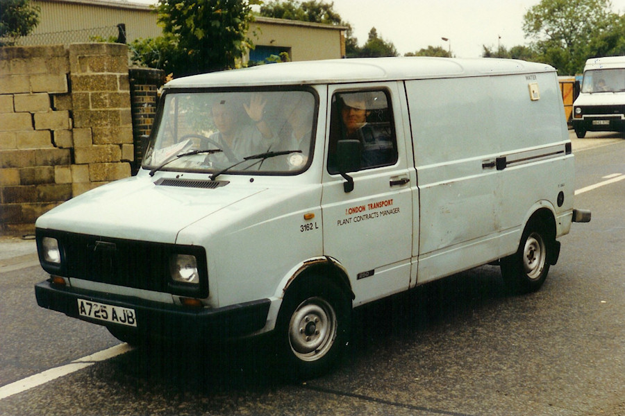 Details: With a wave from the driver, Freight Rover Sherpa van 3162L heads into the back entrance of Chiswick Works on 20th June 1986. Although the cab lettering reads Plant Contracts Manager, this van was actually used by Cleaning Services, along with most of LT's Sherpa-derived vans. Note the water filling point high-up towards the rear. |