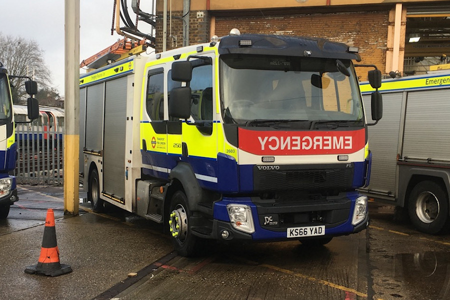 Details: At least nine of the new Volvo Emergency Response Unit rescue tenders were at Acton Works on 30th January 2017, and our correspondent very kindly sent me a batch of photos. Unfortunately, pressure of work has delayed their appearance on LTSV until now. Seen here is 2603 in ERU livery and with a ladder on the roof. The fleetnumber 2603 is also carried by Mercedes-Benz Actros artic WX57NPV, but it appears that the decision to drop fleetnumbers (for 'normal' lorries at least) was made at about the time of its delivery, and it was referred to officially as '57NPV'. The vehicle partially visible on the right of this photo is older ERU tender 2601, showing the general similarity in the bodywork. |