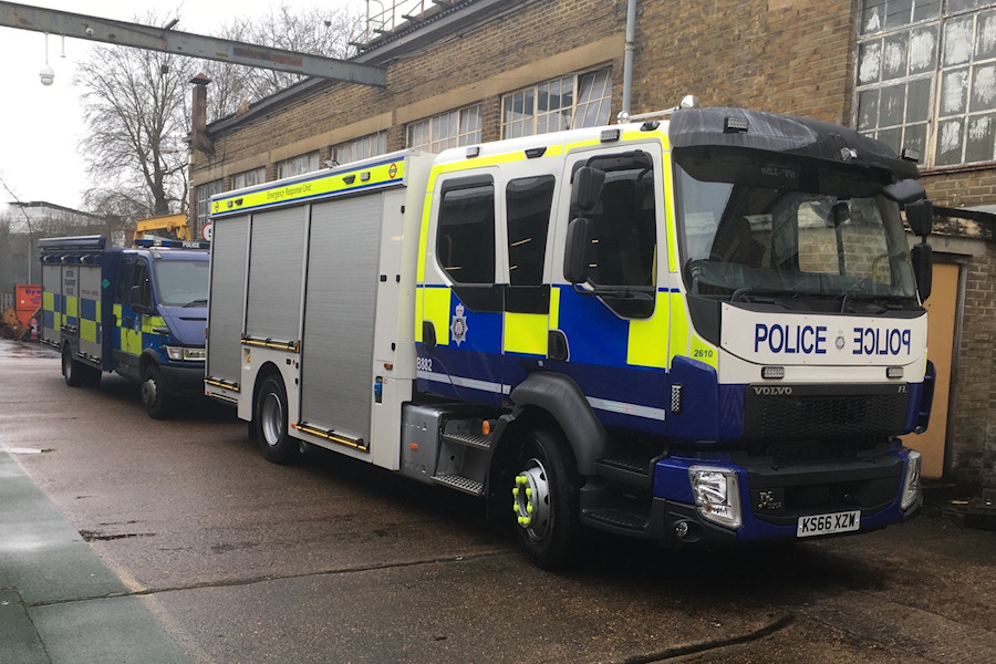 Details: Police-branded rescue tender 2610 was photographed at Acton Works on 30th January 2017. As can be seen, it has fleetnumber 2610 on the front corners with BTP number/callsign B882 towards the rear of the cabsides. Parked behind is Iveco Daily KE05JLV, transferred from BTP to the ERU in 2012. Along with similar KE05JLX, these were used alongside the ten MB Atego tenders and it remains to be seen if they are going to be kept. |