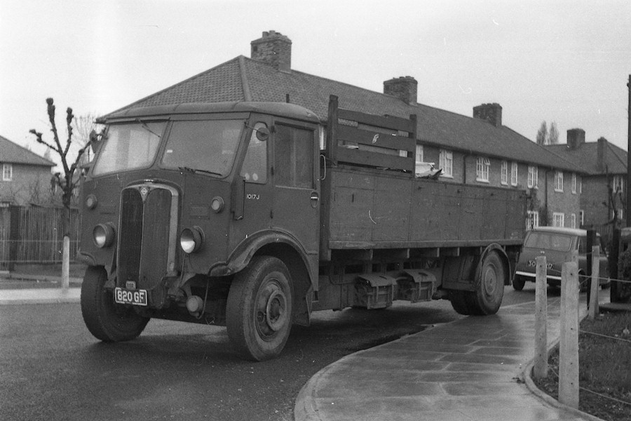 Details: Peter Osborn (of Red-RF fame) recently got in touch to say he had found and scanned a dozen-or-so photos he took of service vehicles in the 1960s. He has posted the images on Flickr but he kindly agreed to my re-using them here. The first four are being posted today, starting with this excellent shot of AEC Regent lorry 1017J taken in White City. 1017J was built using the chassis from bus STL2669 in 1955 (the low chassis frame is clearly visible here) and was based at Southall Bus Garage for the next 10 years. This photo may have been taken after its disposal in June 1965. There is no London Transport lettering or allocation plate, and the trade plate 820GF is not one officially listed as being used by LT. |