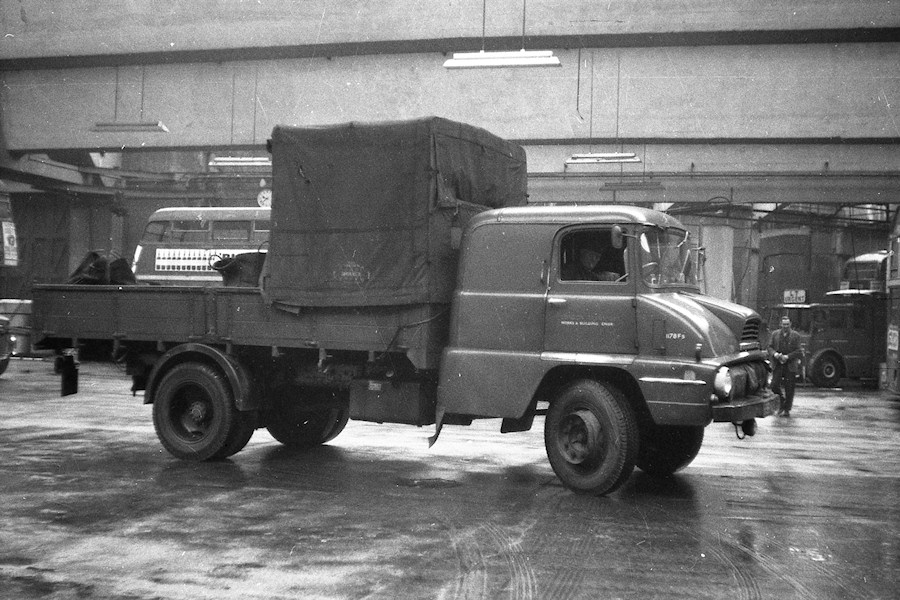 Details: Ford Thames Trader lorry 1178F is seen in what I believe is Shepherds Bush Bus Garage in 1966. New in 1961 it was allocated to the Works and Building Engineer at Parsons Green right up until its withdrawal in 1972. Fitted with a crew-cab (lacking side windows and with a door on the nearside only) and a half-tilt cover, it also had an Epco crane according to official records. The original SUP15 publication listed this lorry (and similar 1179F) as being in Green and Grey livery. Some lorries new in the early 1960s did have grey cabs and green bodywork but this pair appear to have always been all green. Visible in the background is Leyland Titan Railway Breakdown Tender 1276LD. |