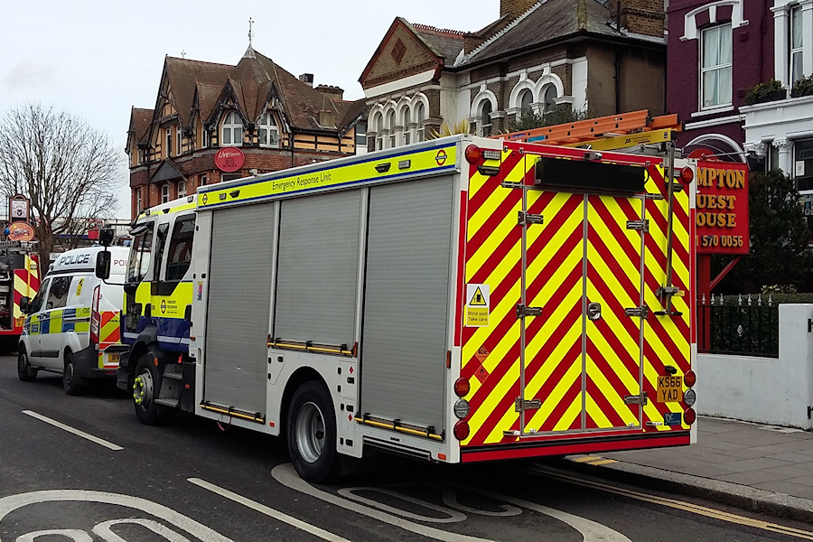 Details: The fleet of new Emergency Response Unit rescue tenders entered service during February 2017 and one of their first major jobs was an incident at Hounslow Central Station on 1st March. Three of the Volvo trucks attended, along with numerous fire, police and ambulance vehicles. Here we see the back end of LUL-liveried 2603. As already mentioned, this one has a ladder rack, including a pull-down handle at the rear, the only one so far noted. Other differences from the police-liveried vehicles are the square hatches either side of the black box at the top of the rear (these being for hose storage), the single (compared to double) light-blocks beside these, the two (as opposed to four) hazard diamonds at the lower left and the noise abatement notice at the front of the side of the body. |