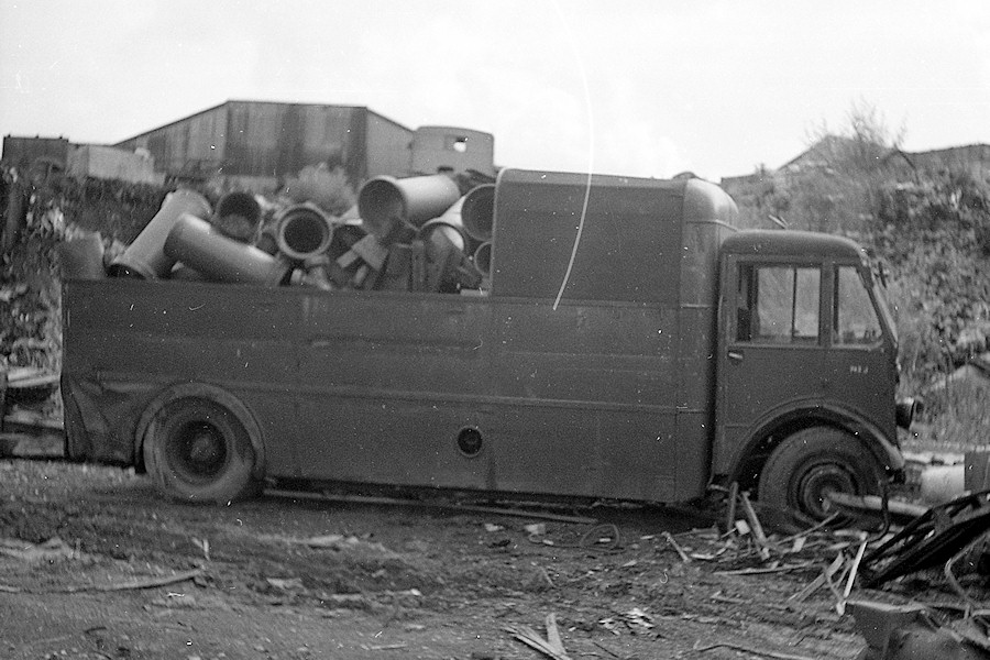Details: A few more oldies from Peter Osborn are first today. Shown here is 743J, a lorry that Clive has recently modelled. As I mentioned at the time, it was unusual for being delivered as a rail carrier but fairly soon afterwards converted into a towing lorry. Withdrawn and sold in 1965 it went to Birds Commercial Motors of Stratford-upon-Avon, where this photo was taken. It still carried fleetnumbers and had been slightly overloaded with pipes. |