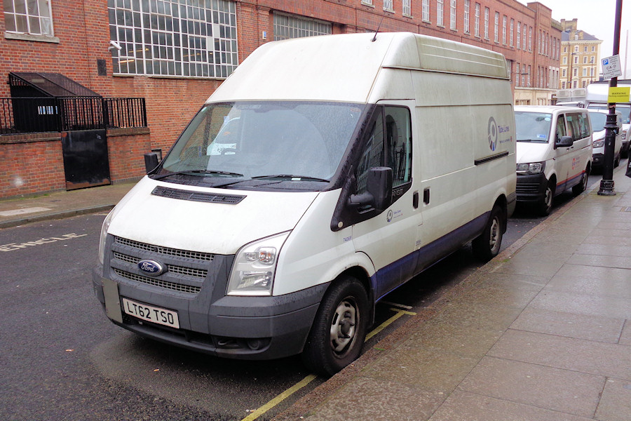 Details: Definitely one of the 'lesser-spotted' members of the current fleet is Ford Transit van 7436F. New in September 2012, it has only been noted five times, most recently at Kings Cross on 12th March 2017 as seen here. It would appear to be based at Ruislip and used by TransPlant to support engineering train operations, although it carries standard TubeLines livery. If correct it would have replaced similar 6711F, which was equally elusive. It is notable that both vans had a fold-over hazard plate on their front bumpers. Parked behind the Transit is new Volkswagen Transporter minibus 8258VW, while mobile office WX08KUY is just visible on the other side of the road. |