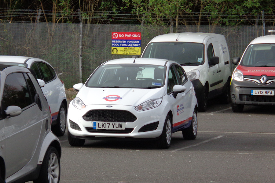 Details: Acton Works car park on 1st April 2017 and Ray has focused on new Ford Fiesta car 8379F. Also in LUL livery is the Ford Focus hatchback just visible on the left. This was registered LK17YUU, but the fleetnumber could not be read. On the back row are two Renault Kangoo maxi vans, one in Tube Lines livery and 7727R of the Emergency Response Unit. Note the unmarked silver Smart car on the left. Although most of the earlier examples have been disposed of, a new Smart in livery was reported at Acton later in the month. |