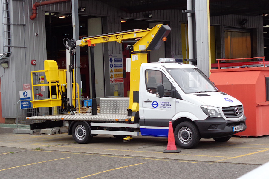 Details: An unusual vehicle new in spring 2017 was 8232, a Mercedes-Benz Sprinter 314 flatbed fitted with a Versalift hydraulic hoist. Although it carries generic Transport for London livery, it has no doubt replaced Ford Transit 6794F, which carried London Buses branding. It is believed that both vehicles were used for fitting iBus equipment to new buses. 8232 was seen at Mandela Way garage on 9th May 2017. |