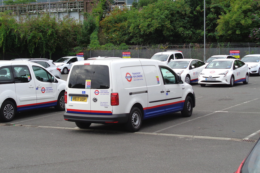 Details: Lots of newly delivered vehicles were visible in the Acton Works car park on 15th July 2017. Nearest the camera was Volkswagen Caddy Maxi van 8475VW, one of at least six for LUL, perhaps to replace the Fiat Doblo Maxi mail vans. On the left is Peugeot Partner Tepee 8023P, while just visible above 8475VW is RE17ADX, a newer example of the same type. On the right are three Toyota Prius hybrid cars, including LL17EFD.