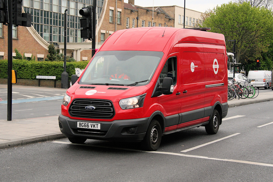 Details: Tower Transit got a new Ford Transit van for its Lea Interchange garage in late 2016. Mk8 high-roof van BG66VKT replaced Mk7 SP12LUO, and was seen passing Mile End on 12th April 2017. |