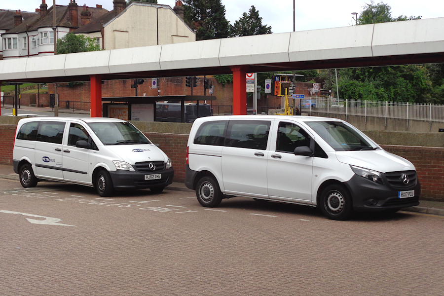 Details: Seen at Eltham Bus Station on 24th June 2017 were a pair of Mercedes-Benz Vito minibuses. To the rear is RJ62ZHG, new to Metrobus as their 8062 in 2013. Although the London Metrobus operations transferred to Go-Ahead London in 2014, the original markings are still carried. The vehicle in front is RX17PCU in unmarked white. This may be a dealer loan or a new acquisition. It was still in use a month later when seen at Belvedere garage. If there are any more sightings I will add it to the database. Note that the Vito design has undergone a facelift with major changes to the detailing around the front and sides. |