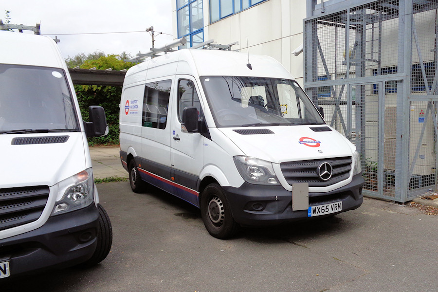 Details: The fourteen Mercedes-Benz Sprinter crew vans leased in autumn 2015 for LUL are quite difficult to see. Most are kept at Stratford Market Depot and hence can only be seen when they venture out, usually at night. There is a pair at Bollo House in Acton but these are well hidden by vegetation from public vantage points on either side (the tube tracks run behind the bushes seen in the background). Ray was granted an official visit to Acton Works and some of the neighbouring locations on 27th July 2017 and caught this view of 8140M with 8141M just visible on the left. |