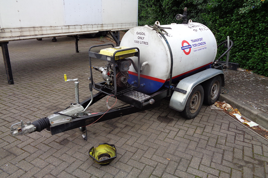 Details: Although it is not marked as such, I am fairly sure this is T70, the Indespension 2-axle mini fuel tanker trailer bought in 1999. If so, it is had some modifications since it was last seen on LTSV (the pump at the front has been changed, some pipework has been added at the top rear and the tank appears to now be secured with a strap!). Most notably though it now has LUL/TfL white/blue/red livery in place of the previous Tube Lines markings. This trailer is very rarely seen out on the road, and even then it is usually carried on a lorry rather than being towed. Seen in the lorry yard at Acton Works on 27th July 2017 with body DB14 in the background. |
