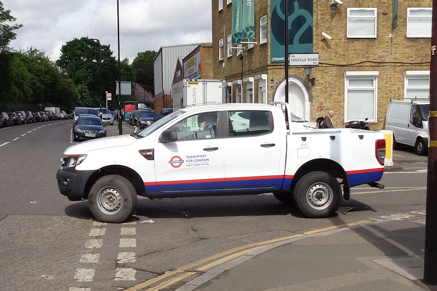 Details: Ford Ranger pick-up 8078F is a rarely-seen vehicle. New in January 2016 we didn't even know who operated it until Ray caught it emerging from Colville Road (near Acton Works) on 16th May 2017. There are three Rangers in the current fleet, all in LUL white/blue/red livery. 8078F seems to be to the same design as Acton-based 8044F, while Leyton's 8064F has a different front grille. 8078F is the only one not to have a hard-top over the loadspace. |