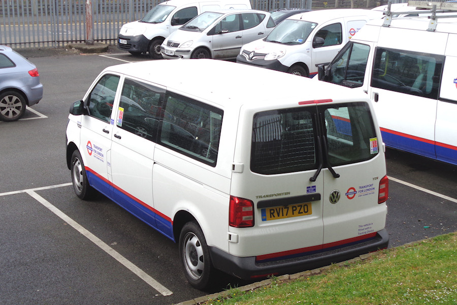 Details: Until this year the Volkswagen Transporter minibus had rarely featured in the central fleet. However, it seems that it is now preferred to the Ford Transit model for this role and at least 8 have been added. 8422VW was new in spring 2017 and was allocated to Neasden station yard, where it was photographed on 1st May 2017. There may have been a problem with this vehicle as it was back at the dealers in mid-July, then seen at Acton Works later in the month. Consecutive registration RV17PZP is on an unmarked white Transporter minibus based at Stratford Market depot. Amongst the other vehicles visible are two Renault Kangoo Maxi vans, 8348R in LUL livery and 7443R in Tube Lines. |