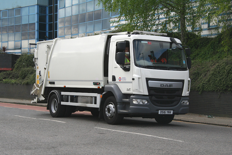 Details: Two DAF LFs with NTM refuse collection bodywork were added to stock in mid-2016. Both were plain white with small lettering, suggesting they may have been on hire rather than bought, but they remained in use for most of the next year. DS16YNV was seen on Bollo Lane in Acton on 12th April 2017. It looks like these replaced mid-sized Iveco dustcarts EK59ZKL/ZKM. The fleet of heavy dustcarts now comprises 8 Mercedes-Benz Econics, all in LUL livery. |