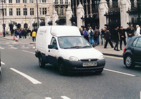 Details: The domination of the LUL fleet by Ford Transits is not complete and some interesting other types can also be seen. Photographed at Parliament Square on 1st April 2000, 5018B (V663PUM) is an example of the early design of Vauxhall Combo van. Being a Saturday, the diminutive passengers would suggest that it was not being used in its primary role at the time. Later Combo vans are to a more aerodynamic design, like 5419V. |