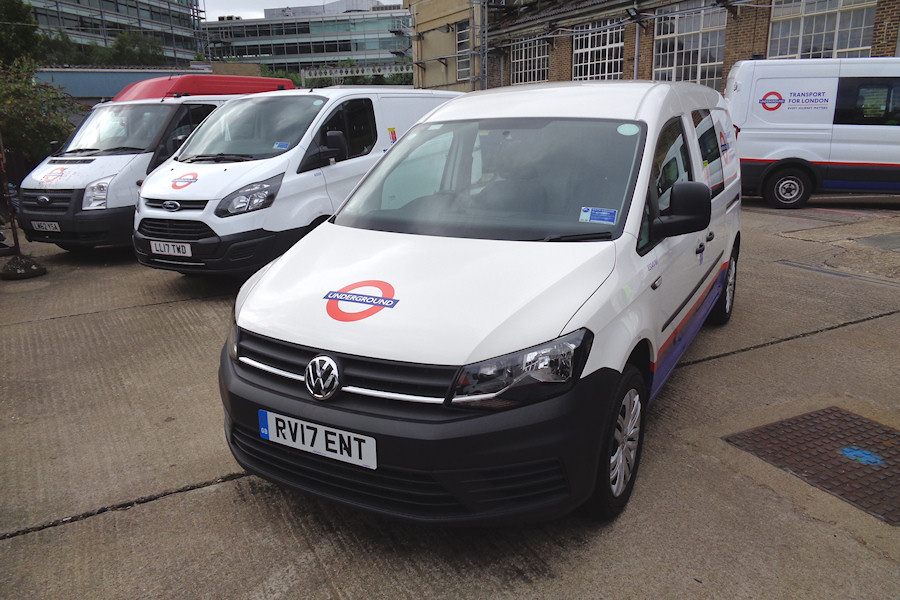Details: Although a large quantity of Volkswagen Caddy Maxi crew vans have been leased in recent months, the fleetnumbers are spread widely over the 82xx and 83xx ranges. We don't know of any in the 84xxs yet but 8504VW was found at Acton Works on 27th July 2017. It was parked next to consecutively numbered 8505F, a Ford Transit Custom van. The red van partially visible in the background is one of 6985F or 6986F, the two Ford Transits with Ashwoods hybrid conversions that were used by LBSL. |