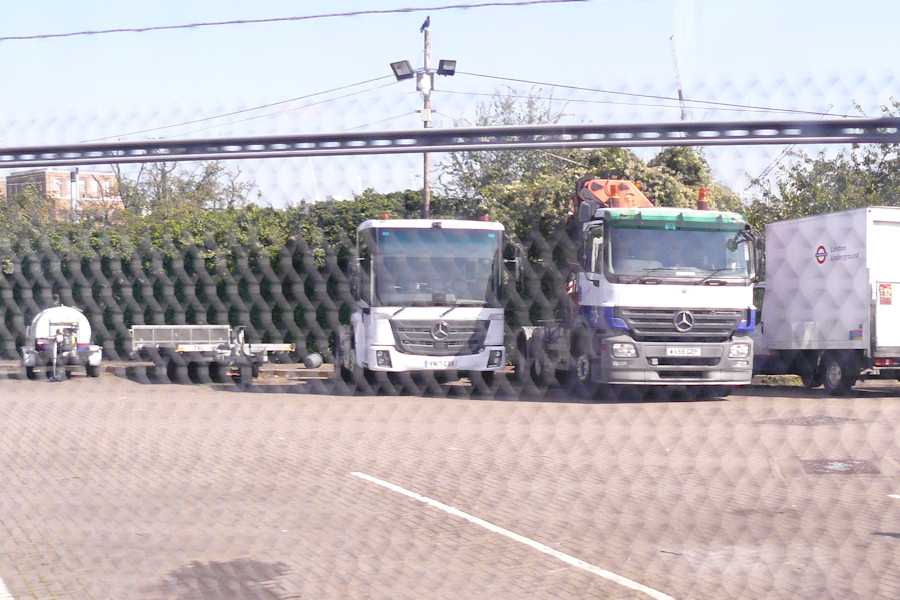 Details: A large number of service vehicles can be seen in the lorry yard at Acton Works from trains passing on the District and Piccadilly lines. I have found that the best way to identify them all is to use a camera, setting it to burst mode and with a fast shutter priority. The results are not usually good enough for publication (especially given the fence in the way) but I have included a few today for various reasons. First up is this view featuring Mercedes-Benz Actros 3-axle artic tractor unit 2591. New in 2006 this lorry features a large folding crane behind the cab, specified to enable the unloading of containers of emergency equipment from trailers. Of perhaps more interest is the white lorry alongside. The cab design is that of the Mercedes-Benz Econic, common as a dustcart and sometimes now also as a tipper. However, this appears to be an artic tractor (going by the apparent length and the shadow), which is not a standard option on the Econic range. Registered YN17CXV, the lorry was presumably hired, perhaps for evaluation. Also visible are (from left to right) mini tanker trailer T70, vehicle-carrying trailer T61 and Ford Transit box truck 7749F. 1st September 2017. |
