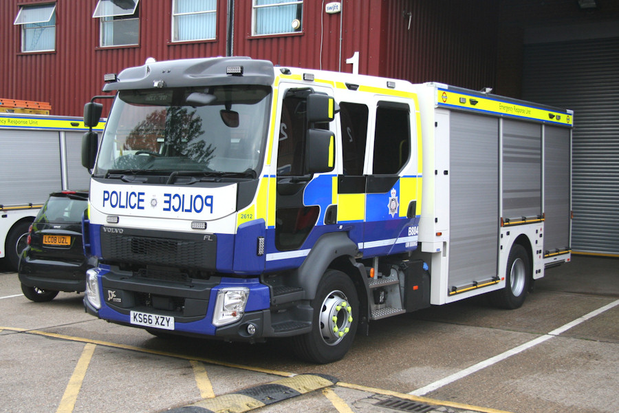 Details: The Emergency Response Unit depot at Camden has two of the new Volvo rescue tenders allocated, including 2612 seen there on 19th July 2017. This is one of five to also have British Transport Police numbers (in this case B884) and it was carrying BTP markings when seen. The front and side panels can be switched to change the livery if needed, since police-liveried vehicles can only be driven by police personnel. Standard ERU liveried tender 2605 is just visible on the left. |