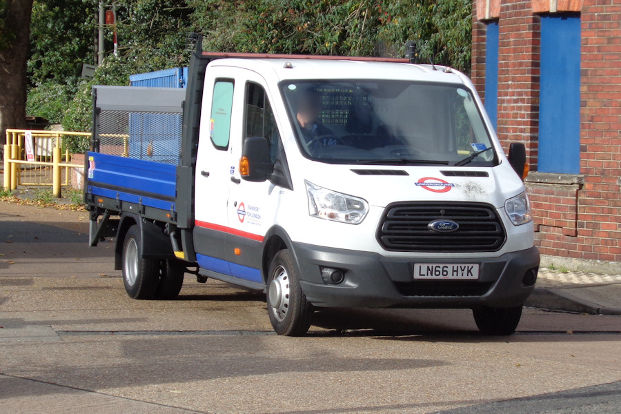 Details: Ford Transit dropside truck 8073F was new in autumn 2016 but has not been seen very much. It is probably based at Acton Works, which it was leaving when photographed on 2nd October 2017. Note that the crew-cab windows are covered over. The lettering on them is not clear but the lower line appears to read 'Tool storage not permitted'. |